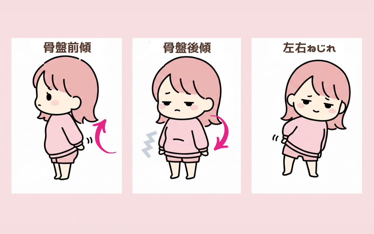 前傾・後傾・左右ねじれの骨盤タイプを、ちいかわ風の女性キャラクターで示したイラスト