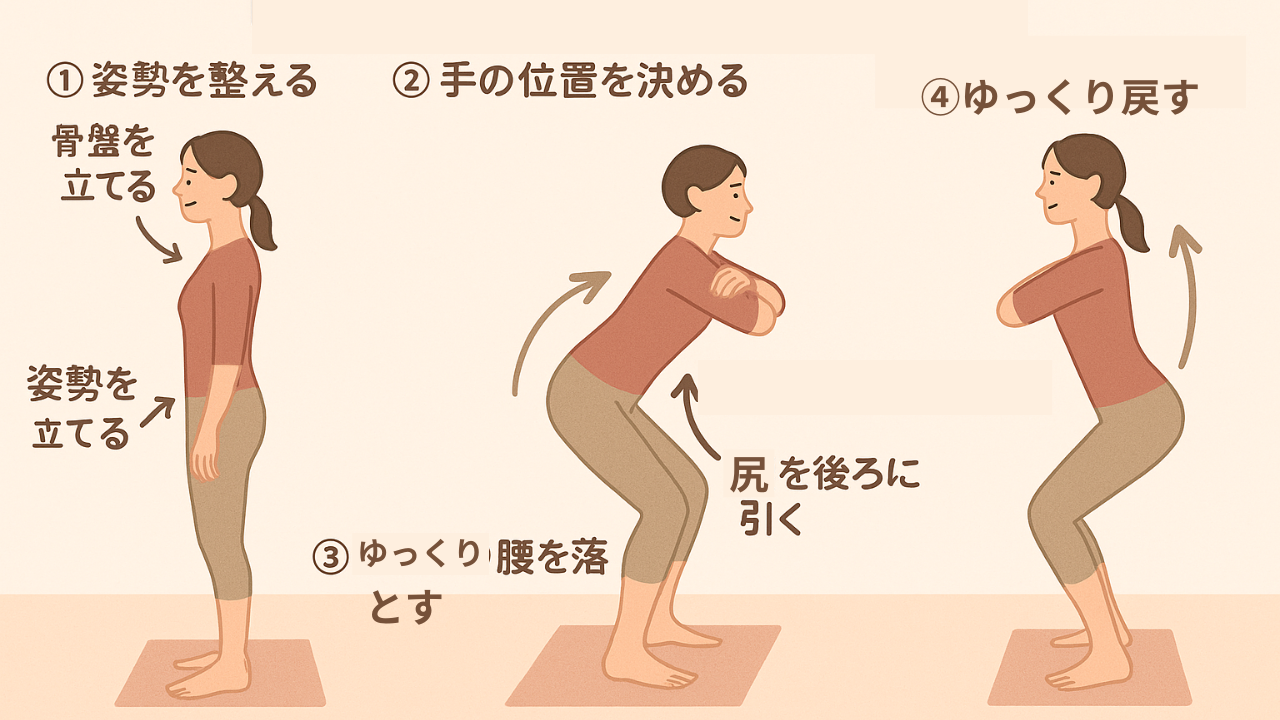 3. ▶ ステップ3: ゆっくり腰を落とす(しゃがむ)