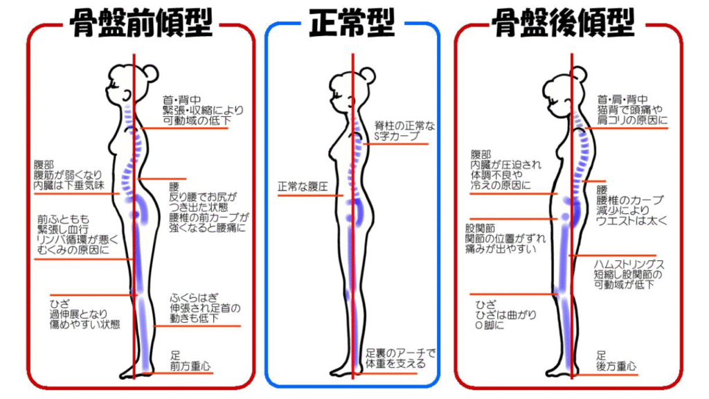 姿勢の特徴: 背中のS字カーブが強くなり、腰が反って見える。太ももの前側が緊張しやすく、腰痛の原因に。
