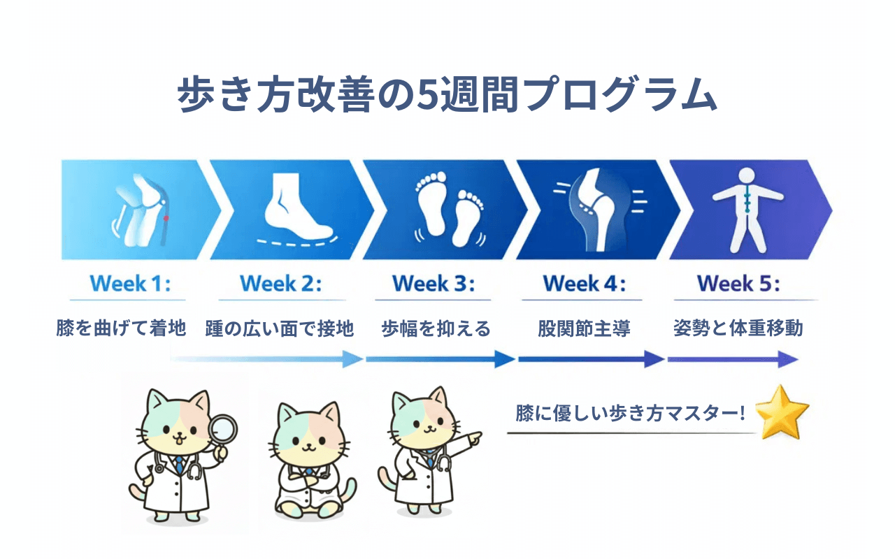 歩き方改善を段階的に習得する5週間プログラムを示したインフォグラフィック。各週で1つずつポイントをマスターしていく流れを、アイコンと番号付きのタイムラインで表現。第1週「膝を曲げて着地」に最重要バッジを付けて強調。色のグラデーションで進捗感を視覚化し、最終週の達成感も表現。